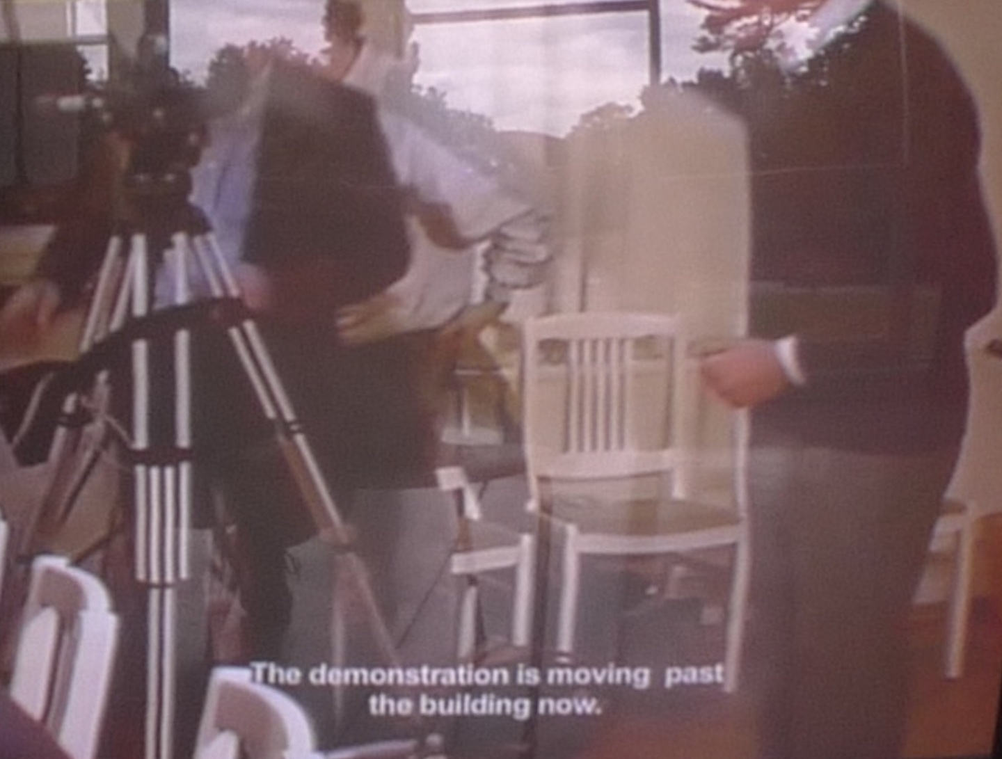 The scene begins when a man comes in from the outside and announces: There is a big demonstration outside.